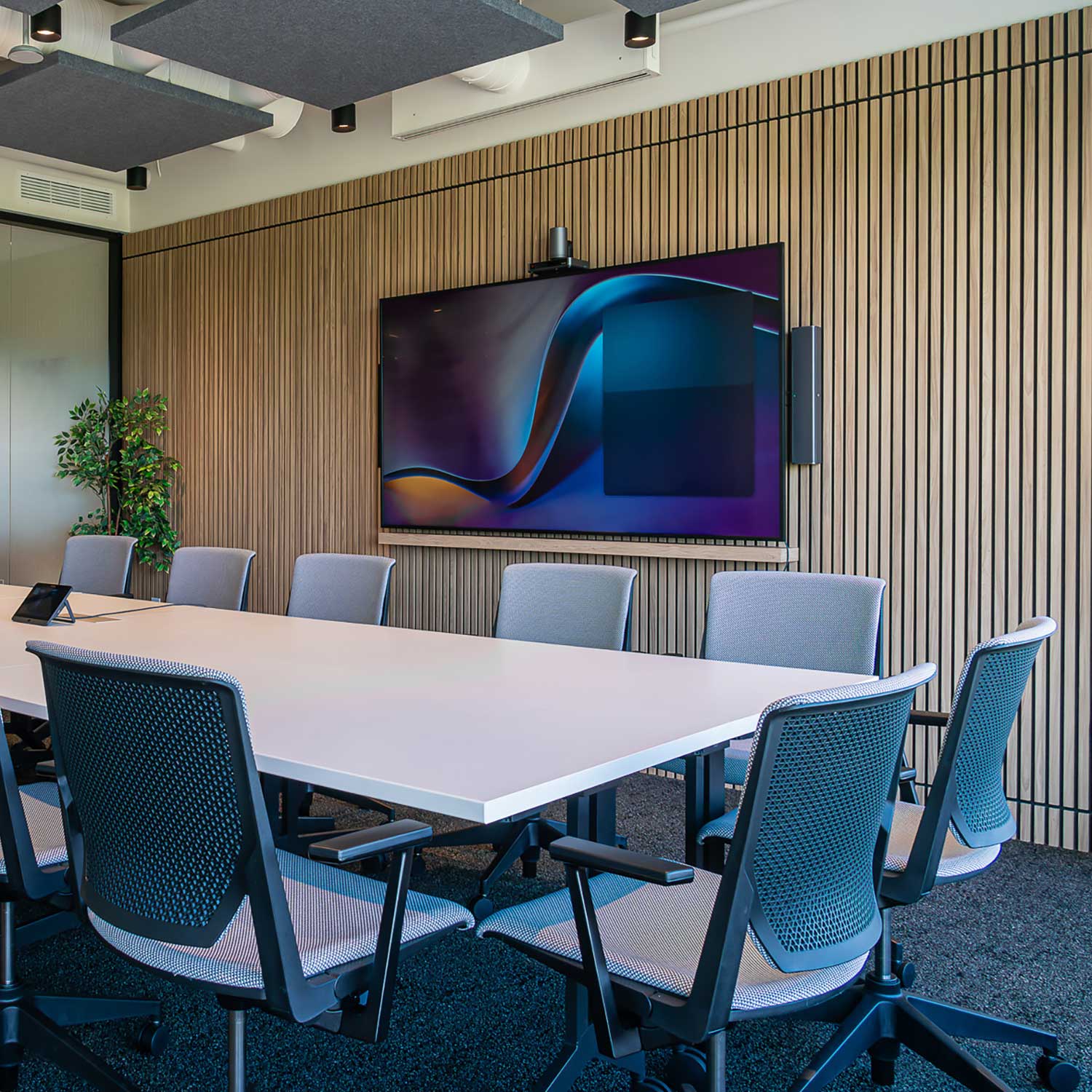 Combining the acoustic tiles with wood finish panels will add grace and sophistication to any design.